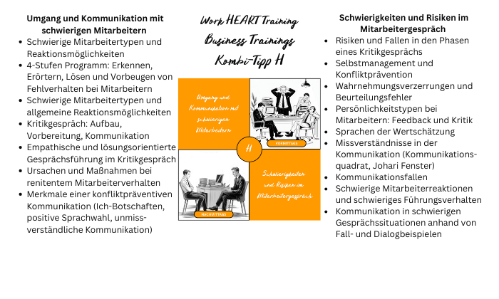 Zu den Softskills in der beruflichen Kommunikation zählt die Empathische Kommunikation zur Konfliktbewähltigung, Mediationskompetenzen zur Konfliktschlichtung zwischen Mitarbeitern oder Kollegen, der Umgang mit schwierigen Mitarbeitern, das Führen von Kritikgesprächen und Vermeiden von Fallstricken und Missverständnissen, Typgerechte Kommunikation mit Kunden oder Mitarbeitern sowie wirkungsvolle Delegation und Überzeugungskraft.