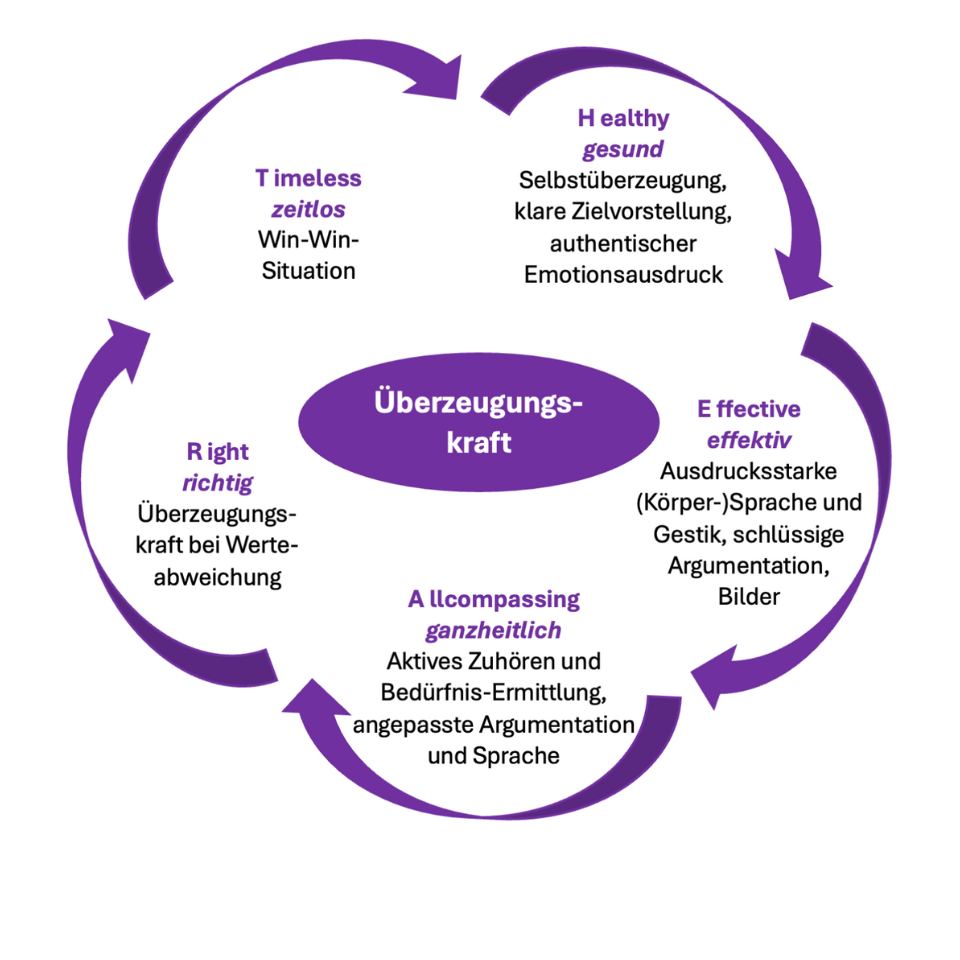 - Überzeugungskraft ist HEART: Selbstüberzeugung, Sprache und Bilder, Bedürfnisermittlung, Überzeugungskraft bei Wertabweichung, Win-Win