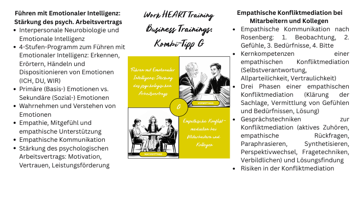 Viele Konflikte im Berufsleben sind emotionsgeladen. Werden die Bedürfnisse und Werte hinter den verletzten Emotionen von beiden Konfliktpartnern verstanden, so können Lösungen entwickelt werden, die nicht nur der praxisorientierten Schlichtung dienen, sondern ein konfliktpräventives Miteinander schaffen, wo die beidseitigen Bedürfnisse und Werte künftig auch in neuen Situationen berücksichtigt werden. Zuerst erwerben Sie Grundkenntnisse zur empathischen („gewaltfreien“) Kommunikation nach Rosenberg. Anhand von Fallbeispielen trainieren Sie die Emotionen von sich selbst und anderen wertfrei und differenziert im Dialog zu benennen und hierbei zwischen dem Sachverhalt und den Emotionen oder Meinungen zum Sachverhalt zu unterscheiden. Dann trainieren Sie im Stufenprogramm zur empathischen Konfliktbewältigung, Konfliktsituationen umfassend zu erfassen, negative Emotionen zu regulieren und durch empathische Kommunikation Lösungen zu erarbeiten, welche die Werte und Bedürfnisse beider Konfliktpartner berücksichtigen.