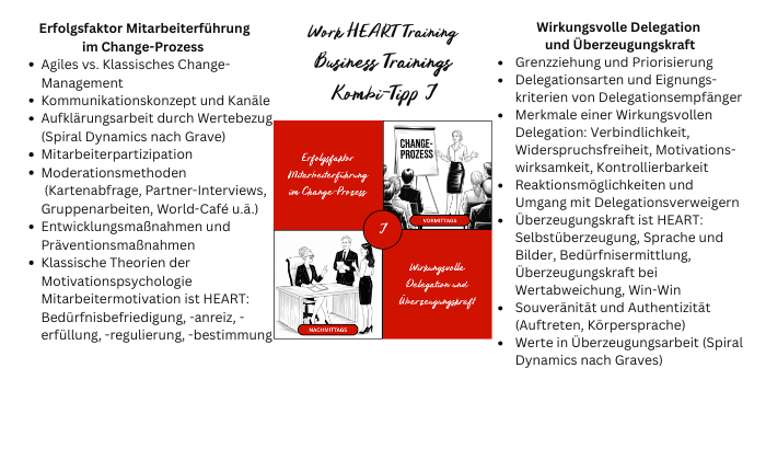 Die Delegation von Aufgaben und Verantwortungen an Mitarbeiter ist in der Regel die Voraussetzung dafür, sich selbst genügend Zeit und Freiraum zur Bewältigung der eigenen Führungsaufgaben zu schaffen. Wirkungsvolle Delegation und Überzeugungskraft sind somit wichtige Softskills im Führungsalltag. Im ersten Teil des Trainings erwerben Sie umfangreiche Kenntnisse und Kompetenzen zu Delegationsarten, Empfängern sowie den Hauptaspekten einer wirkungsvollen Delegation und trainieren diese am Erfahrungsbeispiel. Im zweiten Teil trainieren Sie den Umgang mit Delegationsverweigern. Sie erwerben Kenntnisse und Kompetenzen in Überzeugungskraft, die besonders bei der Delegation, aber auch in anderen Führungskontexten hilfreich sind. Hierzu zählt ein souveränes Auftreten und Authentizität, Überzeugungsarbeit in der Kommunikation durch Körpersprache, Gestik, Argumentation, Illustration ebenso wie Aktives Zuhören und Verständnis und eine Positionierung durch Wertebezug.